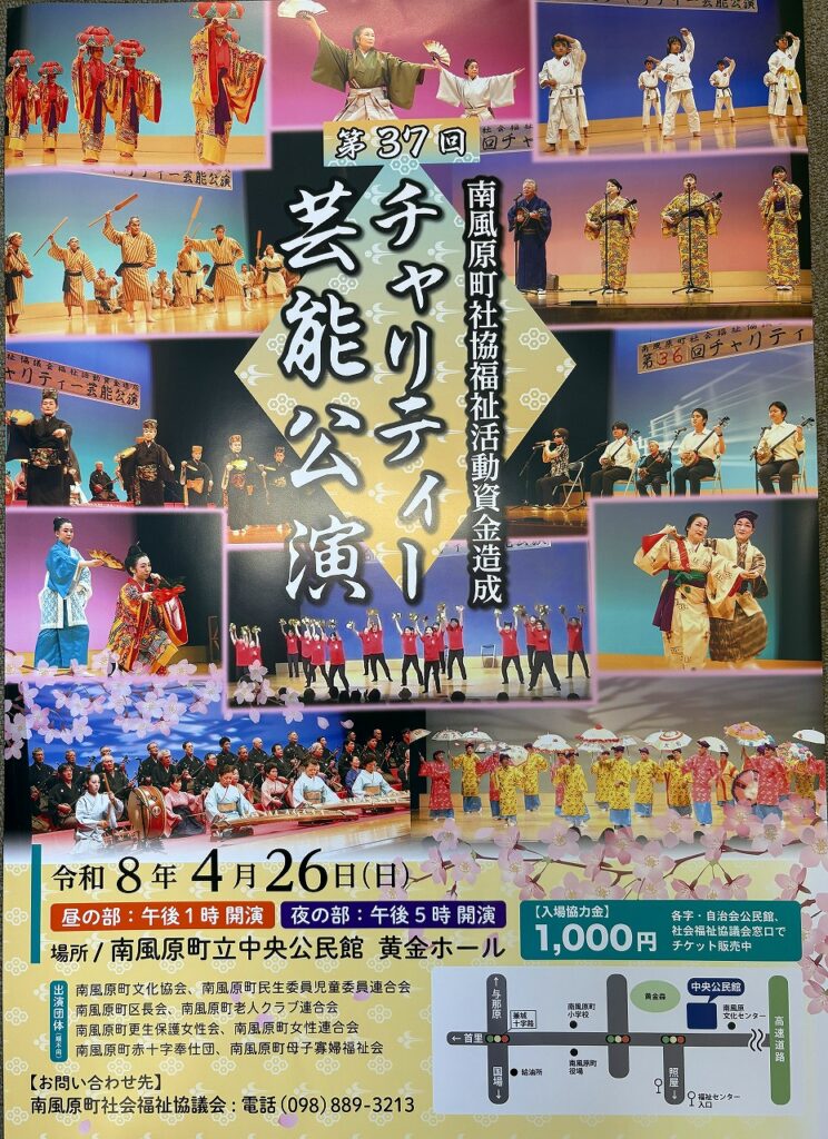 チャリティ芸能公演実行委員会が実施主体となり、南風原町社会福祉協議会が実施する地域福祉活動の推進に貢献することを目的に「第37回南風原町社会福祉協議会福祉活動資金造成チャリティ芸能公演」を開催します。