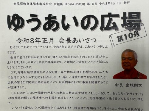 町身障福祉会だより(第10号)発行しました 2025年12月31日 新着情報 身体障害者福祉会発行 by 社協スタッフ02. 南風原町身体障害者福祉会だより「ゆうあいの広場」(第10号)発行しました 南風原町身体障害者福祉会だより「ゆうあいの広場」(第10号)2.93MB(PDF) 音訳ファイル 1P-令和8年正月 会長あいさつ4.83MB(WAV) 1P-カラオケ交流を楽しみました2.03MB(WAV) 2P-北欧生まれのモルック競技に参加しました4.68MB(WAV) 2-第24回全国障がい者スポーツ大会出場報告3.63MB(WAV) 3P-秋の夜長を楽しみました(観月会)3.00MB(WAV) 3P-ボウリング大会2.19MB(WAV) 4P-沖身協主催グラウンドゴルフ大会2.82MB(WAV) 4P-グラウンドゴルフ大会2.61MB(WAV) 4P-南風原町身体障害者福祉会へのご加入について2.21MB(WAV) 前の記事 次の記事