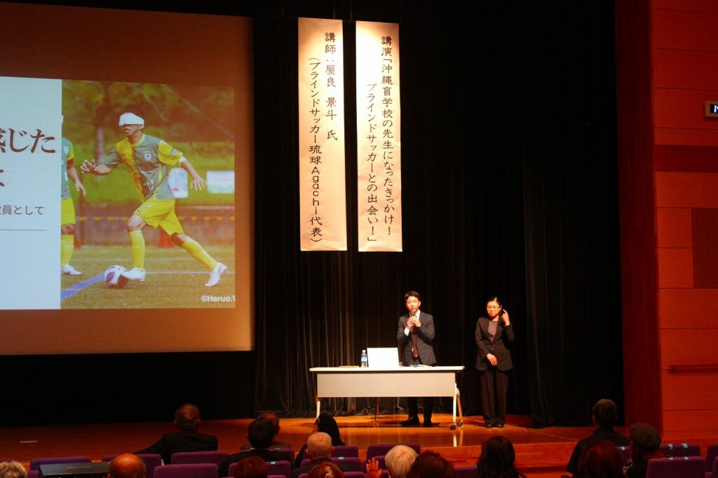 後半では「沖縄盲学校の先生になったきっかけ!ブラインドサッカーとの出会い」を演題に教諭でありまたブラインドサッカー琉球Agachi代表の屋良景斗氏の講演が行われました。