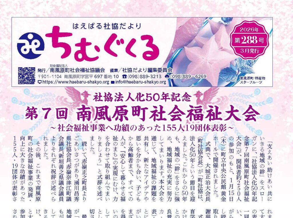 社協だより2026(令和8)年3月号 2026年3月1日 新着情報 社協だより発行 by 社協スタッフ02. 社協だより「ちむぐくる」2026(令和8年)3月号発行しました 社協だより「ちむぐくる」3月号(288号)4.16MB(PDF) 前の記事 次の記事