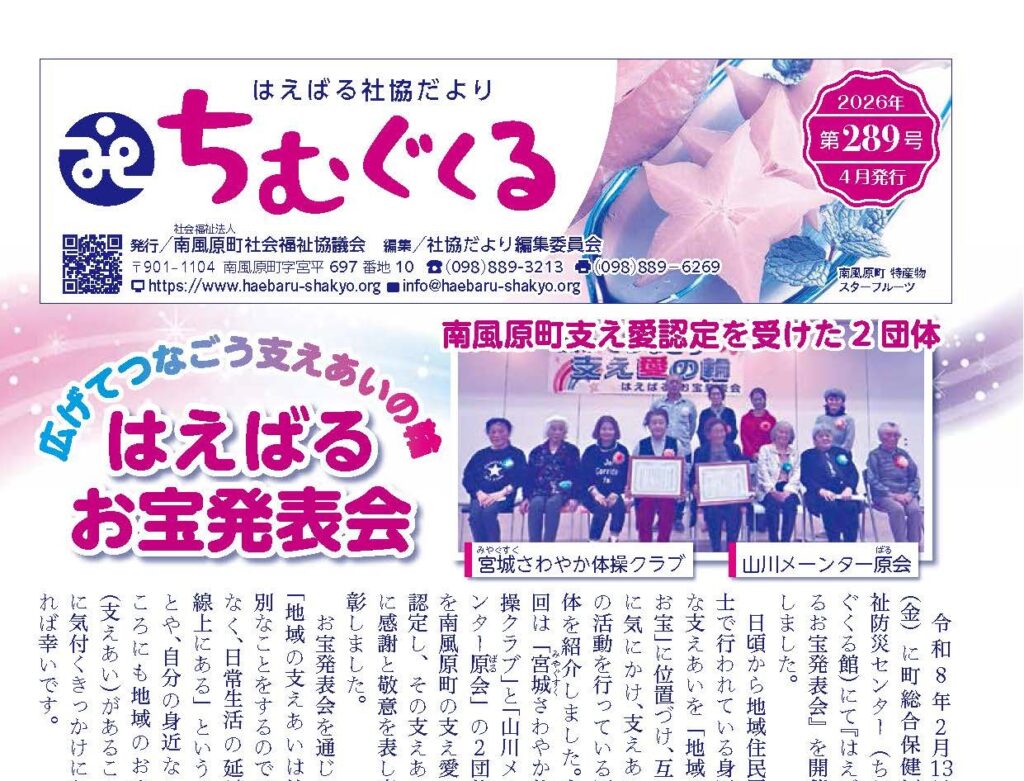 社協だより2026(令和8)年4月号 2026年4月1日 新着情報 社協だより発行 by 社協スタッフ02. 社協だより「ちむぐくる」2026(令和8)年4月号発行しました 社協だより「ちむぐくる」4月号(289号)1.86MB(PDF) 前の記事