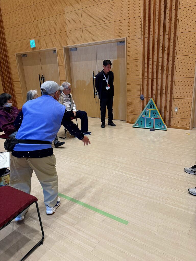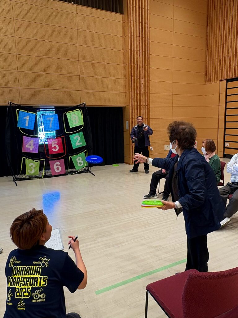 競技は「フライイングディスク」「スカッとボール」「三角ボード」の3種目で行われ、各種目2回ずつ実施。南風原町身障福祉会からは理事4人と事務局の計5人が参加し、いずれの競技でも安定した実力を発揮。全種目で勝利を収める好成績を挙げ、会場を大いに沸かせました。